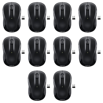 Logitech M325s black ambidextrous wireless optical mouse features three buttons for easy screen navigation. Reduce the clutter on employees' desks with the help of this Logitech M325s black ambidextrous wireless optical mouse. Pre-installed with AA batteries that last up to 18 months, the mouse connects to computers with a small USB receiver. A lightweight and compact design makes the mouse easy to transport, perfect for use with laptop computers in or out of the office. A sleek design gives the mouse a professional appearance ideal for use in a business setting. 10 per pack.