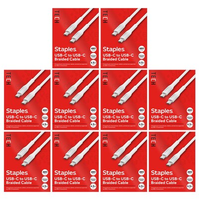 10 Pack- Staples TECH USB-C to USB-C Charging Cable, 6.5 ft., White (ST62335)