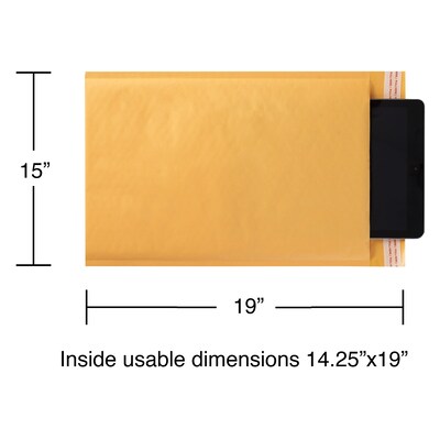 Stock warehouse supply shelves with this 50-count carton of bubble mailers to handle everyday mail processing. Kraft paper exteriors meet a range of shipping needs, and the self-adhesive closures make setup simple. Air-cushioned linings provide added protection against potential damage. These professional 14.25 x 19-inch kraft bubble mailers boast generous dimensions to accommodate products, parts and other items.