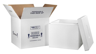 Protect your perishable products during shipment in these Staples insulated shipping containers. Each kit includes an interior seamless molded EPS foam container to maintain temperatures. Printing on the outside of each box informs the shipper that the items are perishable and indicate which side is up to ensure your products are handled with care.