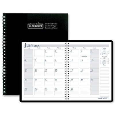 House of Doolittle's environmentally responsible collection includes this 14 month academic planner July to August one month per two-page spread with a black 2 piece leatherette cover and 3 holes punched for a standard 3-ring binder, previous and the following month reference calendar and note space on each month. Go Green with House of Doolittle products, we use 100% recycled paper containing 100% post-consumer waste with soy inks, 50% recycled cover material, and 90% recycled wire. All of our products are manufactured in the USA