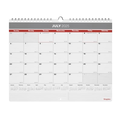 2025-2026 Staples 15" x 12" Academic Monthly Calendar, Gray/Red (ST62816-25)