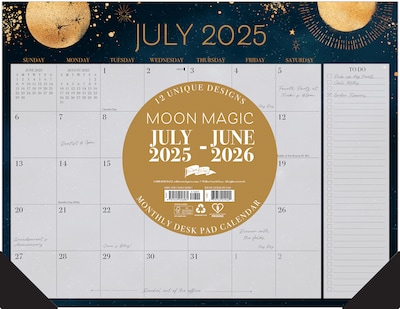 CELESTIAL SPECTACLE – Bask in the luminous glow of the full moon's splendor, or rest and recharge in the darkness of the new moon. From waxing to waning, humans have followed the ebb and flow of the lunar cycle for centuries, embracing our cosmic state of impermanence and reassuring us that change is a reliable, inevitable constant. The Moon Magic 22" x 17" Academic Deskpad Calendar reminds us to enjoy the journey and treasure the special things in life from July 2025 to June 2026.