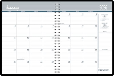 This monthly planner has 24 months, December-January. The 2-piece spiral bound with 90% recycled wire black leatherette hard cover that folds over to create a sturdy writing surface will last throughout the years. A perfect planner for the busy professional with room to note necessary appointments and needed information. It has one month per 2-page spread with generous note space for important information. The lightly ruled daily blocks keep notations neat. Includes Julian Dates and days remaining, important dates and holidays, and a 3-year reference calendar. It is printed on 100% post-consumer recycled paper with soy-based inks. Proudly manufactured in the USA.