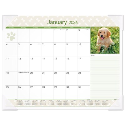 Liven up your workspace with the AT-A-GLANCE Puppies adorable calendar. One month per page features unruled daily blocks, with space for notes, reference calendars, and a different puppy photo each month. Covers a 12-month date range from January 2026 to December 2026