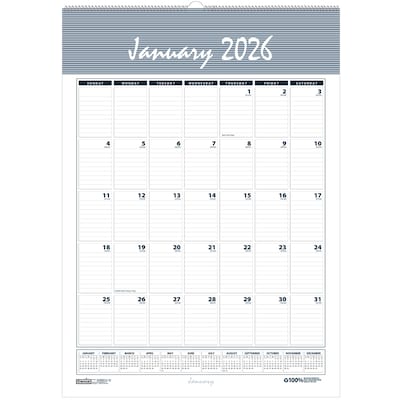 This 100% recycled Bar Harbor Wall Calendar is printed in soothing wedgwood blue and gray colors that complements any decor with a professional appeal. Ruled daily blocks keep notations neat. Full-year reference calendar aids in planning throughout the year. Neutral graphics to match any decor. Full chipboard back and a sturdy wire hanger to easily hang the calendar on the wall. Spiral bound with 90% recycled wire binding plus full chipboard backer and a wire hanger to easily hang the calendar on the wall. Printed on 100% post-consumer recycled paper with soy-based inks. Proudly manufactured in the USA.