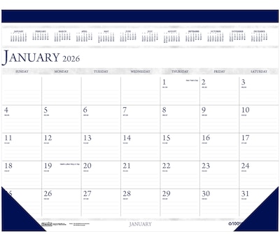 This 100% recycled compact two-color desk pad calendar has 12 months, January to December. Perfect size for smaller work surfaces. Large ruled daily blocks for neat notations provide plenty of note space. Manufactured proudly in the USA