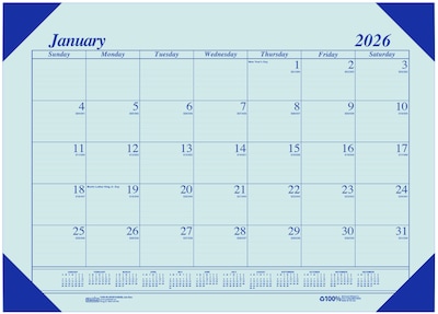 This 100% recycled EcoTones monthly desk pad calendar is ideal for any personal work space or home office environment. The blue pastel paper and four blue reinforced corners is very soothing on the eyes. Proudly made 100% in the USA