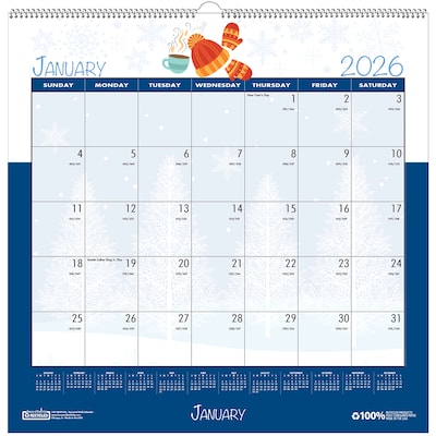 This 100% recycled Seasonal/Holiday Wall calendar adds a little fun to your day. It features a different animated holiday and season lively design each month. Daily bocks are unruled for open planning. Proudly manufactured in the USA.