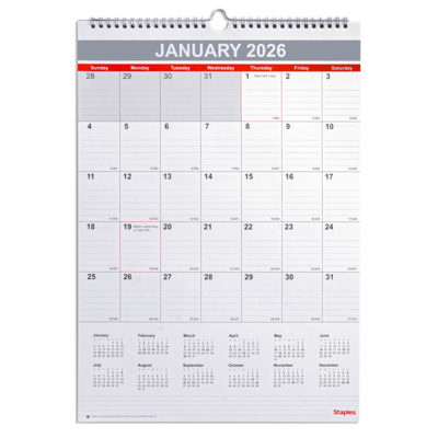 Keep track of appointments with this vertical wall calendar. The monthly-view format lets you plan for future events, while the black ruling clearly display dates, the days and the month for quick referencing. This Staples 12 x 17-inch wall calendar can be hung vertically and is spiral-bound for easy page flipping.