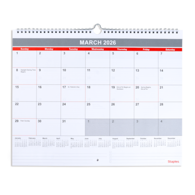 Coordinate meeting dates easily using this white, red and gray wall calendar. The monthly view format features a full year's date at the bottom for planning ahead and ruled lines for capturing important details. Featuring a horizontal orientation and spiral spine construction, this Staples 15 x 12-inch wall calendar is easy to view and lets you easily flip between pages.