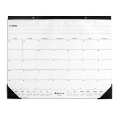 Complete your workstation essentials with this 12-month desk pad calendar. The heavyweight paper withstands daily handling, while the headband binding keeps the pages together and lets you flip through the sheets easily. This Staples 22 x 17-inch January 2026 to December 2026 desk pad calendar has 12-month date tables printed on each page and convenient holiday indicators for easy reference.