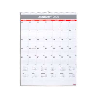 2026 Staples 22.19" x 29" Monthly Wall Calendar, White/Red/Gray (ST63005-26)