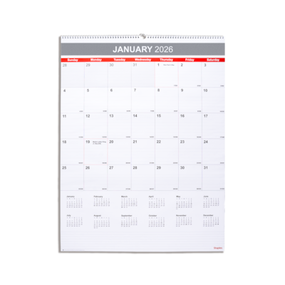 2026 Staples 22.19" x 29" Monthly Wall Calendar, White/Red/Gray (ST63005-26)