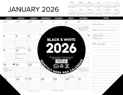 Stay organized in sleek style with this large deskpad calendar, featuring a classic black and white design with plenty of space for schedules, notes, and deadlines. Perfect for jotting down important dates and notes, this calendar is a versatile addition to your workspace.