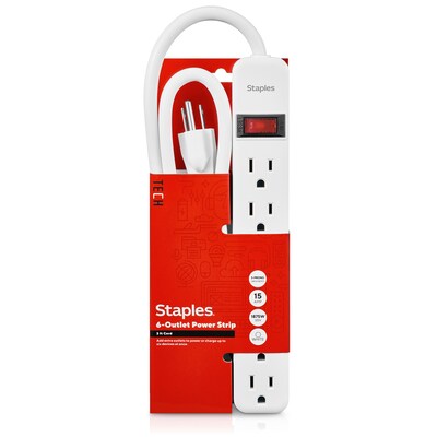 Organize electrical cords and keep all your devices charged with this 3-foot six-outlet power strip. Featuring six three-prong grounded outlets, this power strip makes it easy to keep a variety of devices charged and lets you reach inconveniently placed wall outlets with a 3-foot cord. This Staples TECH white six-outlet power strip lets you know when it's receiving power with an illuminated power switch.