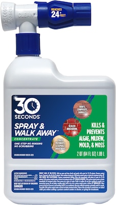 Kills Lichen, Moss, Mold & Algae in one easy step. Simply Spray & Walk Away. 30 SECONDS Spray & Walk Away is a slow release formula that works over time. Mother Nature does the work for you, eroding the treated matter, while it decays over the coming weeks. Perfect for those LARGE surface areas that you can Spray & Walk Away¨; Subdivision walls, roofs (composite, glazed, Tiled and Shingles), pathways, sealed brickwork and concrete, asphalt driveways, vinyl and aluminum siding, wood decks and many other hard surfaces. And best of all it saves water, time and money in not having to pressure wash or rinse off. Safe around play areas, gardens and pets when used as directed. Contains no bleach and is phosphate free.