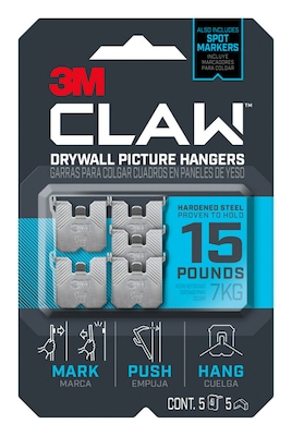 - TRUSTED STRENGTH: 15 lb. 3M CLAW Drywall Picture Hangers made of hardened steel, each picture hanger proven to hold 15 lbs., so you can hang decor, such as pictures, mirrors and other heavy objects; Also includes spot markers