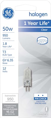 GE 50 W T-3 JC Halogen light bulb in clear color delivers crisp white light and gives a dramatic effect. Bulb has an average life of 2000 hrs and is perfect for use with outdoor carriage/post lights.