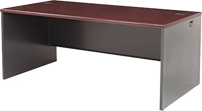 HON® 38000 Series Desk shell in mahogany/charcoal finish measures 29 1/2" X 72" X 36" and has steel reinforced work surface.