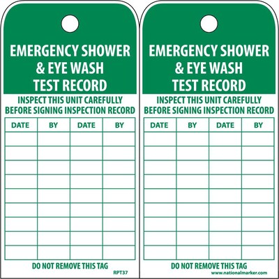 National Marker "Emergency Shower And Eye Wash Test Record" Accident prevention tag warns on potential hazards & offers information at job site. Tag includes self-locking nylon fasteners and complies with all safety regulations, sold as 25 per pack.