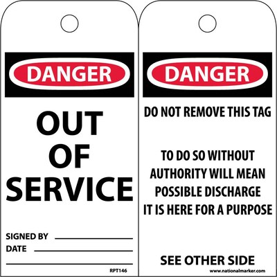 National Marker " Out Of Service" Accident prevention tag measures 6" x 3" and is made of 0.015 mil unrippable vinyl material for added durability.