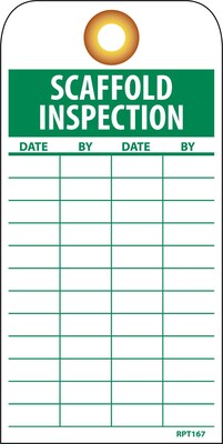 National Marker " Scaffold Inspection" Accident prevention tag with grommet measures 6" x 3" and is made unrippable vinyl material for added durability.