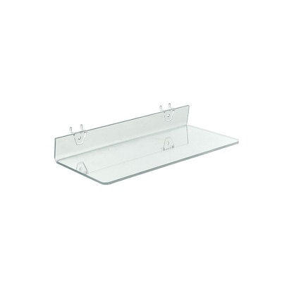Azar® Clear acrylic shelf for use on pegboard and slatwall system has a dimension of 16" x 6" x 2"and is ideal for displaying cosmetics.