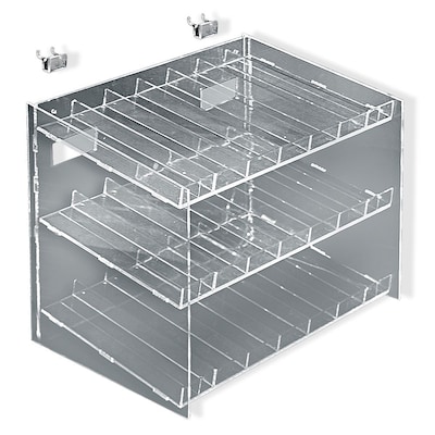 Azar® 3-tiered 21 Compartment cosmetic counter display for pegboard or slatwall comes with the dimension of 12" x 10.5" x 8" with each slot measuring 1.5", it is made up of molded acrylic with two U-hooks for attachments.