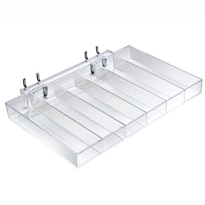 Azar Displays Six Compartment Pegboard / Slatwall Eye Shadow Tray this molded acrylic display tray can be used to display pegboard, slatwall, or counter top with 2 plastic U-Hooks. Ideal to display lipsticks and small products.