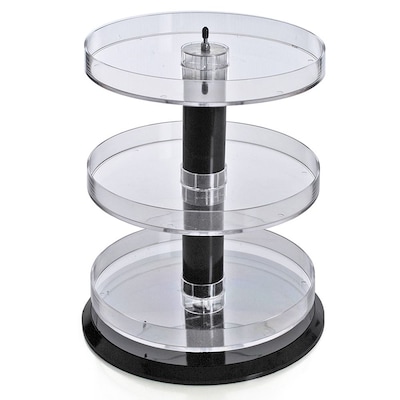 Azar Displays Three Tier Acrylic Open Round Tray features three 11" round trays along with a revolving base, providing easy customer access. Its base and center tube is available in black color. Ideal for displaying small products!