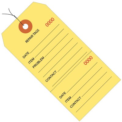 BOX Yellow repair tag measuring 4 3/4" x 2 3/8" is sequentially numbered in order to maintain records and is pre-wired for convenience, sold as 1000 per pack..