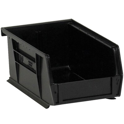 9 1/4" x 6" x 5" black plastic stack & hang bin BOX has built in rear hanger which allows bin to hang from lowered panels or rails. Quill Brand Stack and Hang bin BOX in black color measuring 9 1/4" x 6" x 5" is made of plastic for added durability. BOX fits shelf size up to 9 1/4" for holding small items and has a built-in rear hanger that permits bins to hang from lowered rails.