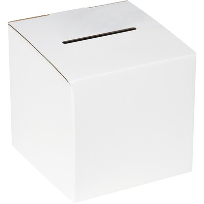 Give guests, staff or customers a convenient way to submit forms or tickets with these white ballot boxes. Sturdy corrugated construction offers added strength and resilience, and the simple slot accepts paper while still limiting access to the contents stored within. The white color lets you add labels, stickers or custom lettering. These Staples ballot boxes boast a simple design for quick, easy assembly.