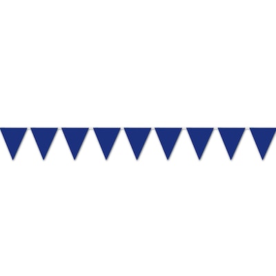 Beistle "Indoor/Outdoor" Pennant banner in blue color is made of all-weather plastic for durability. Banner measuring 10" x 12' has 12 pennants on the string, sold as 4 per pack.