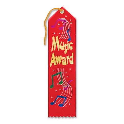 Beistle "Music" Award ribbon measuring 2" x 8" would make a great party item for school day occasions, sold as 9 per pack.