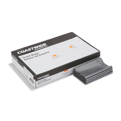 Stay on top of your office waste with these gray trash bags. The star-sealed bottom distributes weight evenly to reduce the risk of tears and leaks, while the super heavy-strength linear low-density polyethylene resists puncturing from sharp objects, making them suitable for cafeterias and institutional use. These 30 to 33-gallon Coastwide Professional™ trash bags come in a carton of 100, ensuring an ample supply for your cleaning closet.