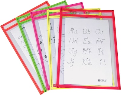 C-Line Reusable dry erase pocket featuring assorted neon colors can be used with worksheets measuring 9" x 12" and cleans easily by soft dry cloth or tissues which is sold as 10 per pack.