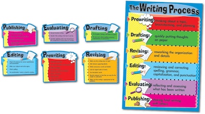 Carson-Dellosa™ The writing process bulletin board set with writing theme is ideal for grades 3 - 8 and above. Board set includes 6 die-cut pieces featuring drafting, prewriting, evaluating and publishing to improve the knowledge of children.