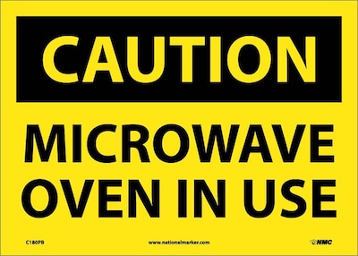 National Marker "Caution Microwave Oven In Use" Safety sign measuring 10" x 14" is made of adhesive vinyl material for durability.