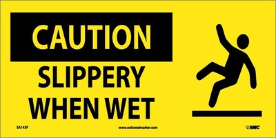 National Marker "Caution Slippery When Wet " Safety sign with graphic measures 7" x 17" and is made adhesive vinyl material for added durability.