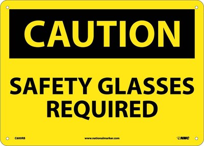 National Marker "Caution Safety Glasses Required" Safety sign measuring 10" x 14" is made of rigid plastic material for durability.