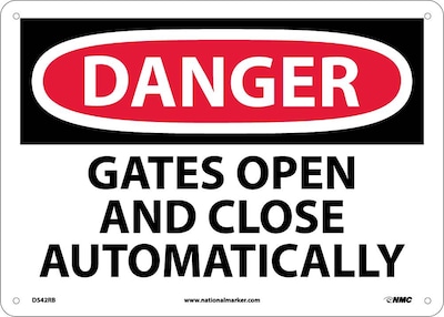 National Marker "Danger Gates Open And Close Automatically" Safety sign measuring 10" x 14" is made of rigid plastic material for durability.