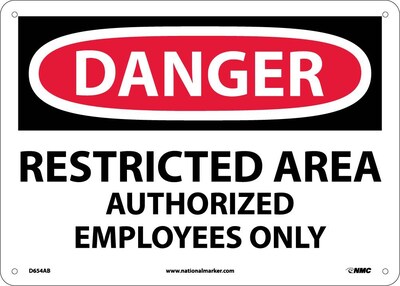 National Marker "Danger Restricted Area Authorized Employees Only" Safety sign measuring 10" x 14" is made of 0.040" aluminum material for durability.