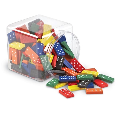 - Set includes 168 wooden dominoes, in 6 double-6 sets, storage bucket, and activity guide. The 6 colors are red, orange, yellow, green, blue, and black.