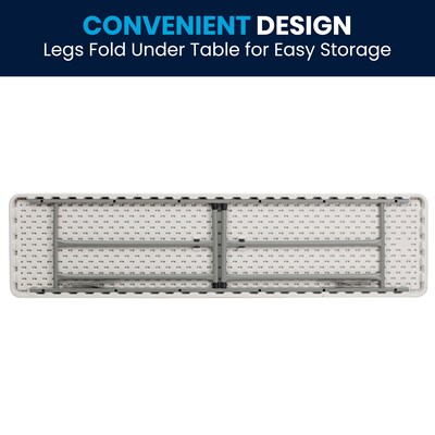 Fill that new designated training room with this narrow rectangular plastic folding table. The space saving design can fit multiple tables in small and large rooms making it the perfect training style table for any classroom or training facility. Have people pick up test packets and informational pamphlets on this perfectly sized folding table. Cleanup is simple on this durable, waterproof top to pick up spills quickly. This 6-Foot folding table seats 3 people on one side of the table allowing all at the table a clear view of the board and instructor. When you want to store or transport the legs lock underneath the top. Folding tables can be your go-to table to setup your products at convention centers.