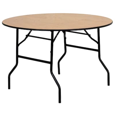 Be ready for your next event with this round wood folding table that is a great option for special event planners, catering companies and banquet facilities. The plywood tabletop is 4' in diameter, .75" thick, and will comfortably seat up to 4 adults. This durable table features a 440 pound static load capacity. A clear coated top finish and black T-Mold edge band prevents table cloth snags and splinters. Attractive black powder coated wishbone legs are made from 18 gauge steel, lock securely in place while in use and fold up neatly underneath to transport and store. Protective floor caps protect your floor by sliding smoothly when you need to move it. This durable, easy-to-clean table is commercial rated for use in banquet halls, convention centers and at trade shows.