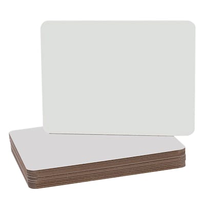 Economical, unframed lap board with a plain dry erase surface is ideal for doodling, math or handwriting practice and more! Great for school, office or home use. Quality write-and-wipe surface is non-ghosting. Hardboard backing is warp and chip resistant. Rounded corners and smooth edges for safety and comfort. Each dry erase board measures 9.5" x 12" x 0.125". Set of 12.