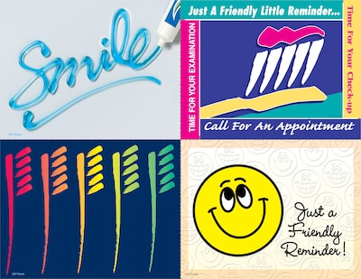Attention-getting postcard captures your patients attention. The back of the postcard is blank so you can add a personalized message, using your own Laser Printer. Uncoated stock, perforated sheets. Four cards to an 8-1/2" x 11" sheet. 100 cards. Detached size: 4-1/4" x 5-1/2".
