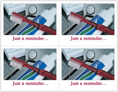 Attention-getting postcard captures your patients attention. The back of the postcard is blank so you can add a personalized message, using your own Laser Printer. Uncoated stock, perforated sheets. Four cards to an 8-1/2" x 11" sheet. 100 cards. Detached size: 4-1/4" x 5-1/2".